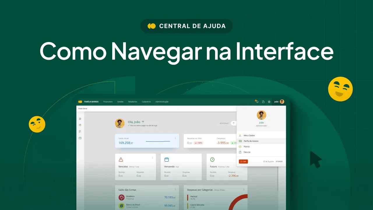 - Usuário: acesse seus Dados, visualize os Perfis de Acesso e gerencie Planos e Faturas.